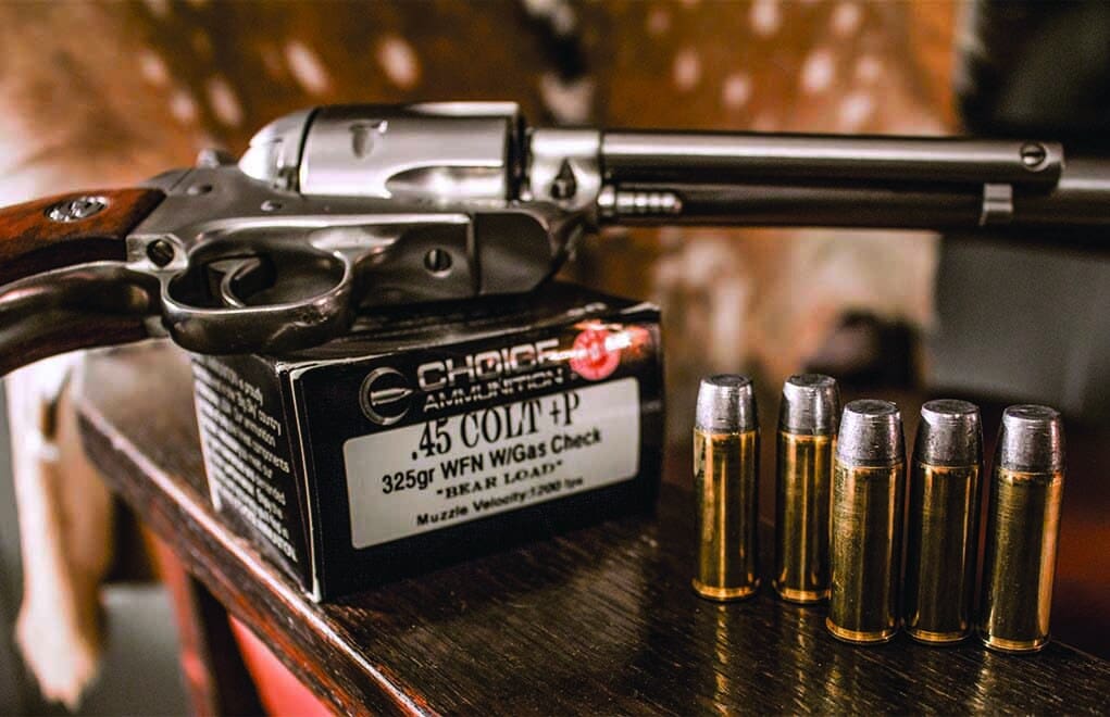 My Ruger Blackhawk isn’t particularly finicky. With its 7½-inch barrel, I feel I’m good to hunt out to 50 yards with open sights. I like the wide variety of loads available, and a trio of loads from Choice Ammunition highlights the capabilities of the .45 Colt very well; I use all three.